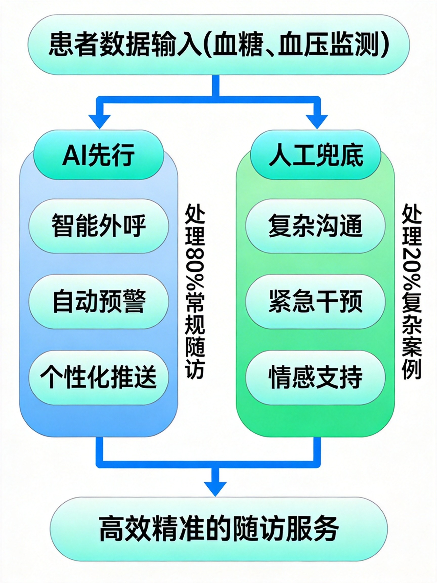 根据我们的实践,答案是:恰恰相反。AI替代的是那些重复、繁琐的“事务性工作”——打电话提醒复查、手工录入问卷、翻找病历。